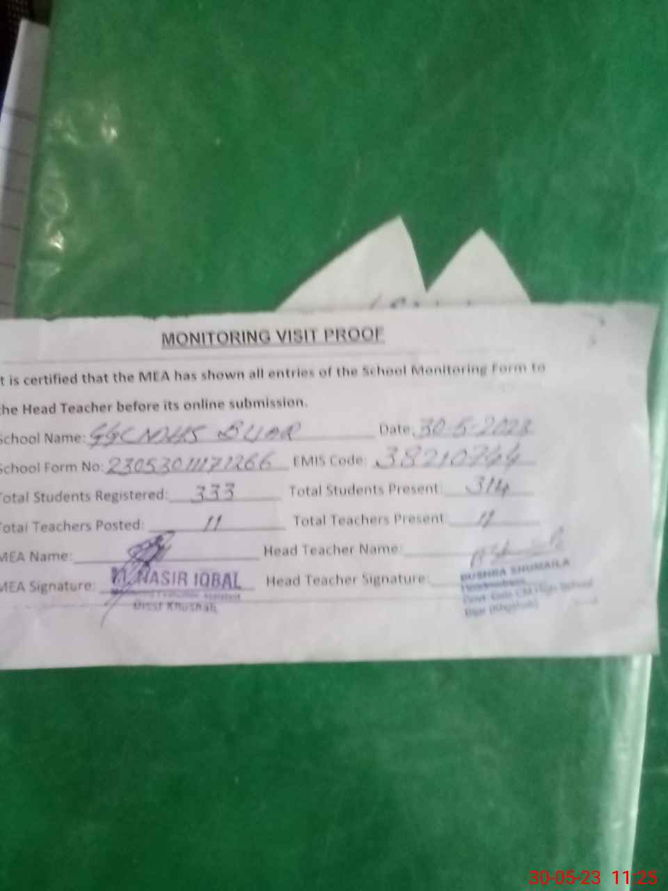 | Attendance Register | Head Teacher | MEA with School | Visit Proof |