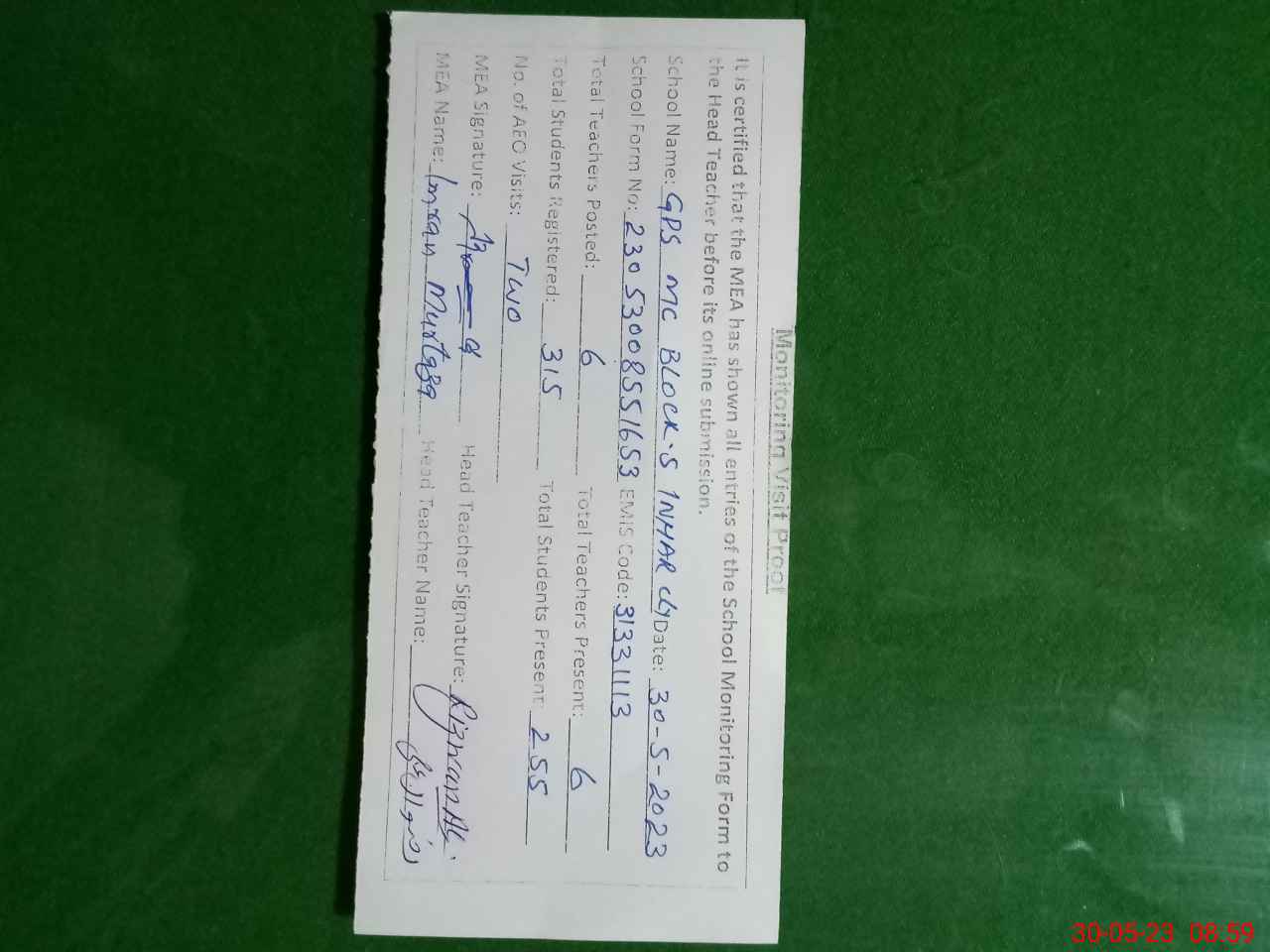 | Attendance Register | Head Teacher | MEA with School | Visit Proof |