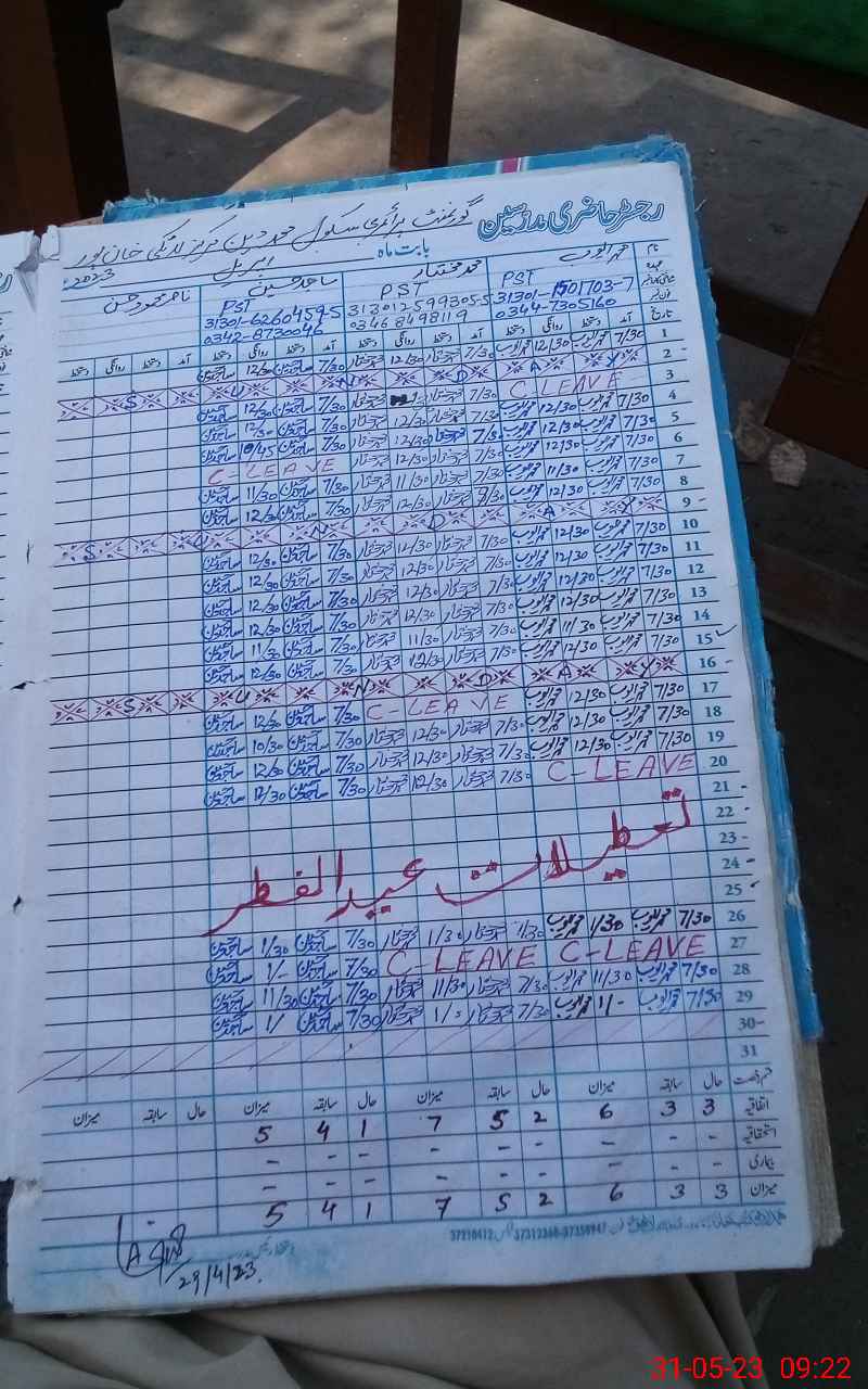 | Total no. of Classrooms: 3 No. of Classrooms Used for Teaching: 2 No. of Classrooms Storing Old Furniture, FTBs, etc: 0Comments if Any: Satisfactory and teacher Nasir Hassan is absent from from Nov 22 to till now and NSB cash book not complete from Oct 2022 to till date |