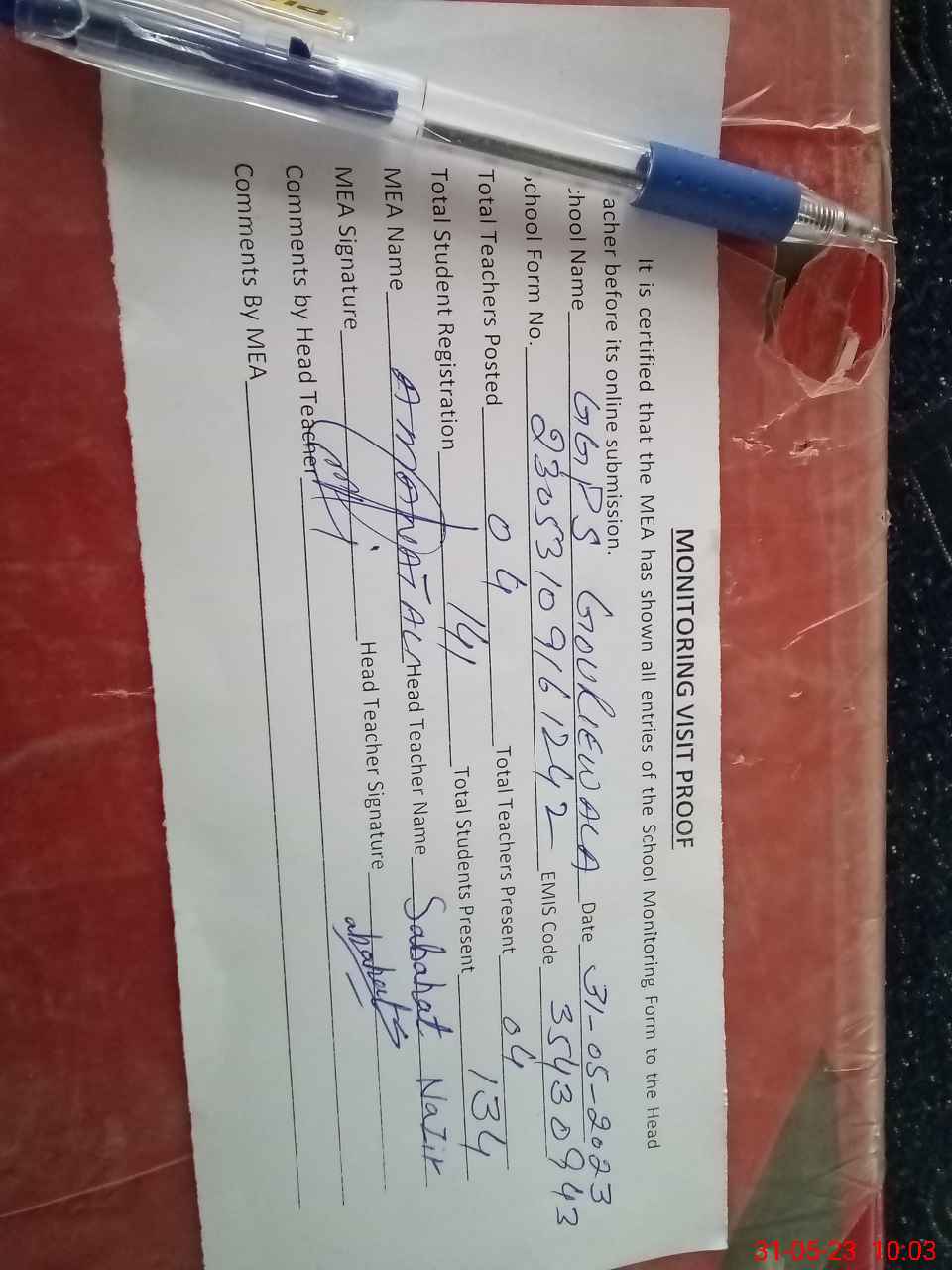 | Attendance Register | Head Teacher | MEA with School | Visit Proof |