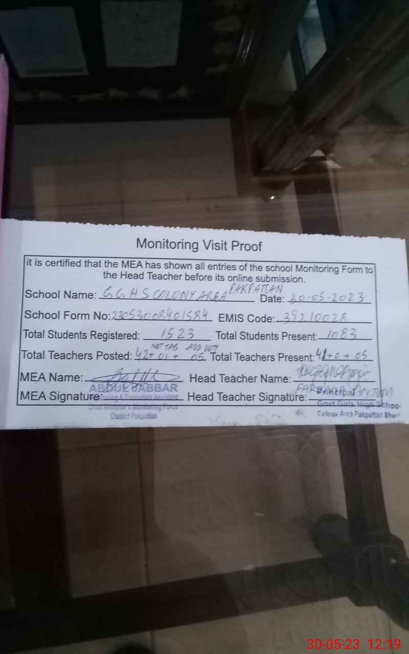 | EMIS Code: 39210028 | Name of School: GGHS COLONY AREA PAKPATTAN | |||