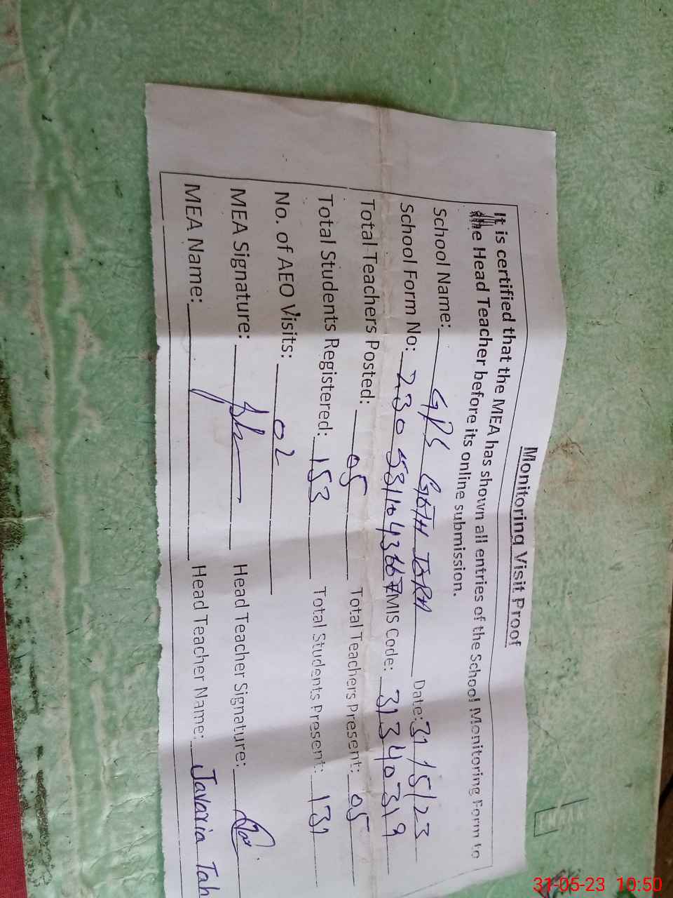 | Attendance Register | Head Teacher | MEA with School | Visit Proof |
