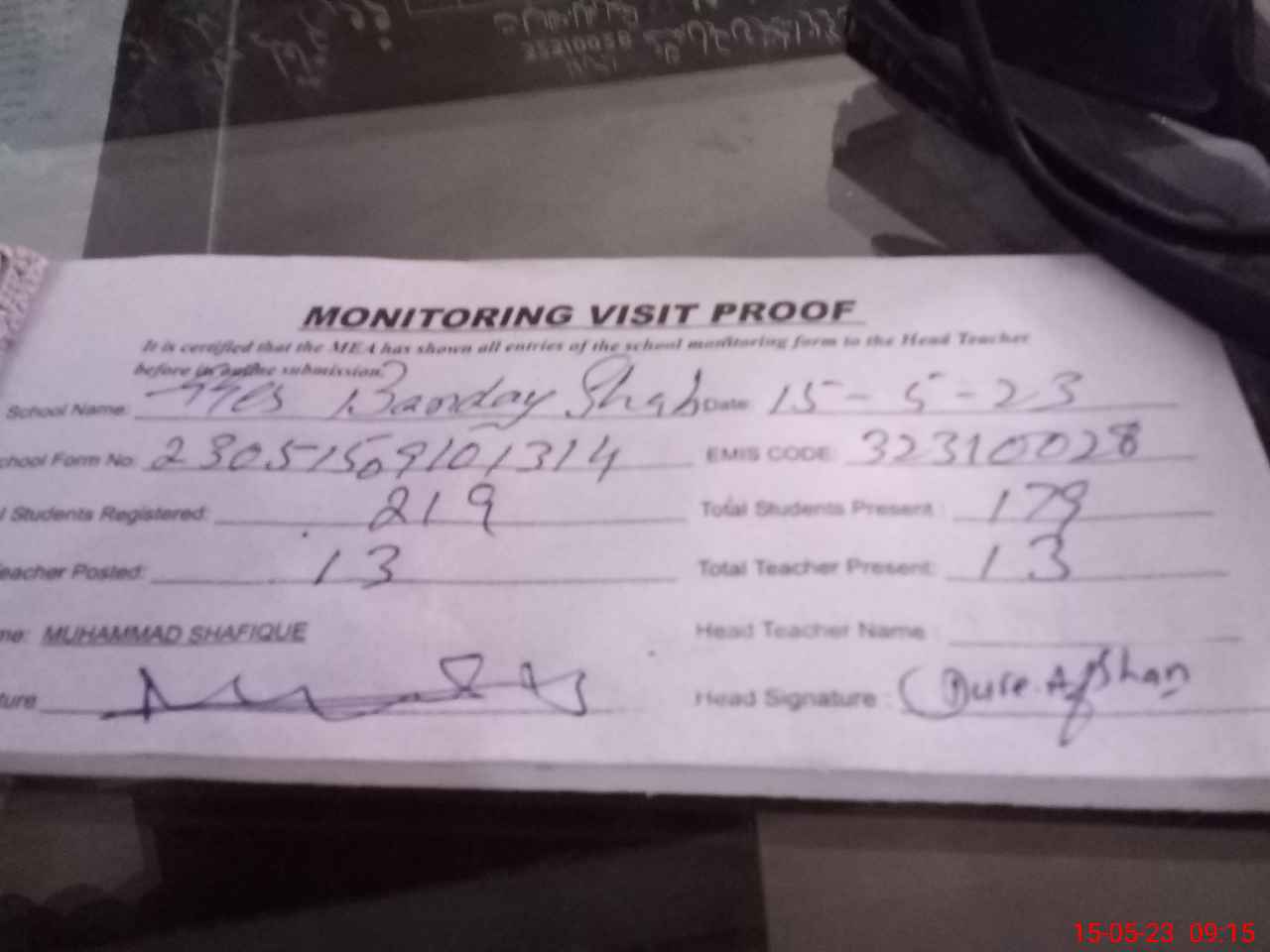 | Attendance Register | Head Teacher | MEA with School | Visit Proof |