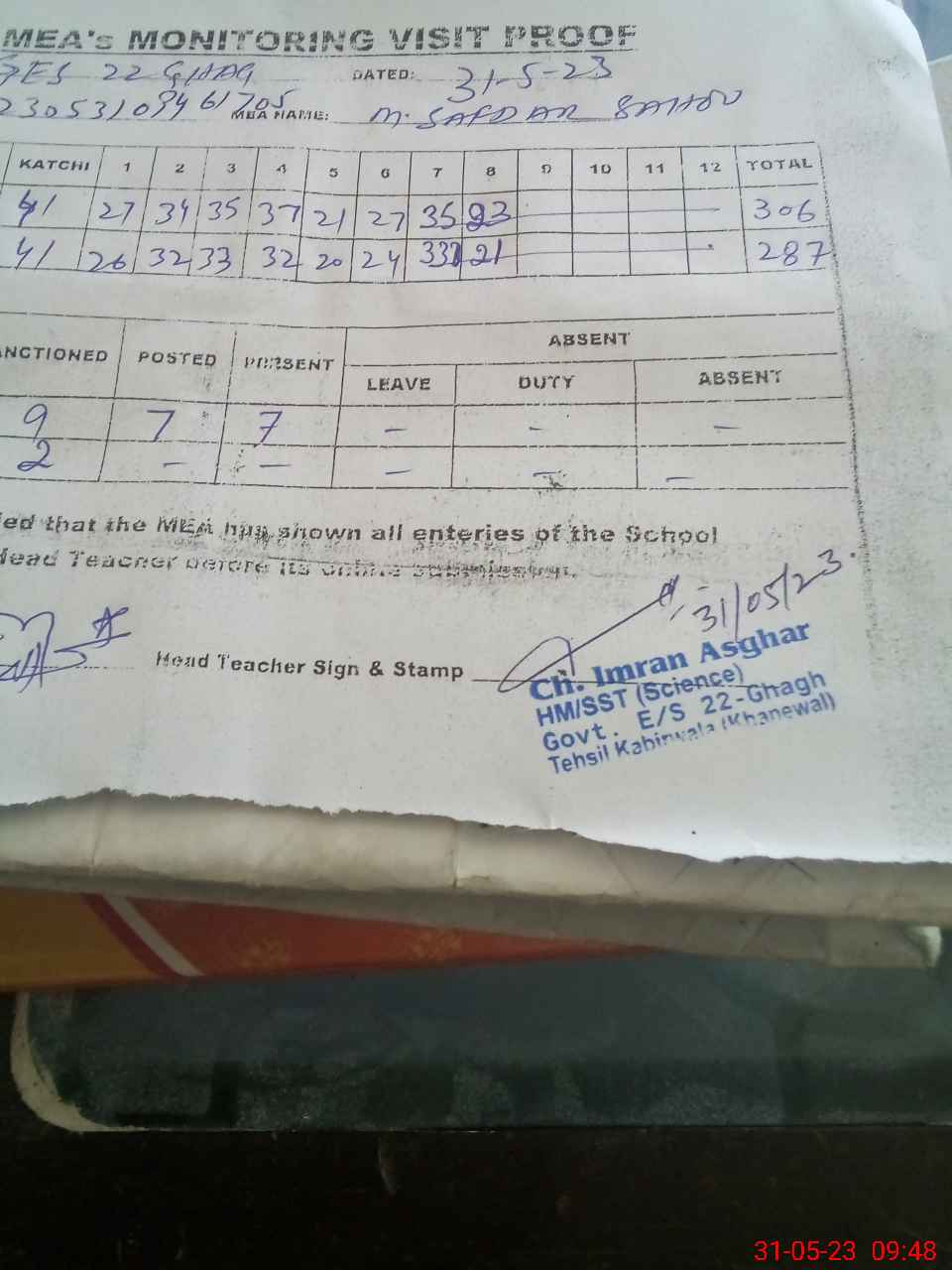 | Attendance Register | Head Teacher | MEA with School | Visit Proof |
