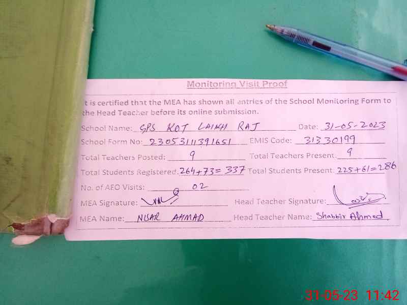 | EMIS Code: 31330199 | Name of School: GPS KOT LAIKH RAJ | |||