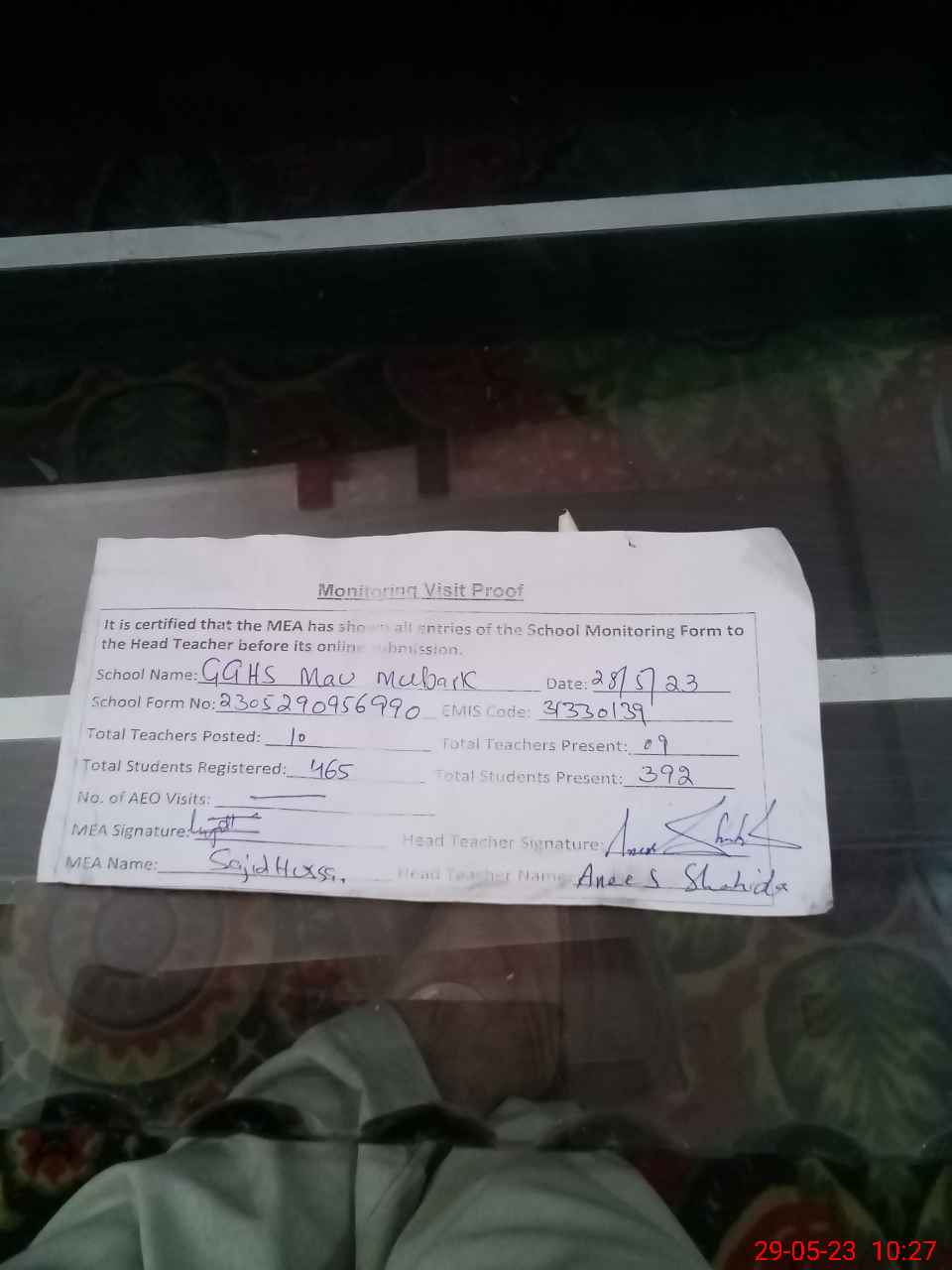 | Attendance Register | Head Teacher | MEA with School | Visit Proof |