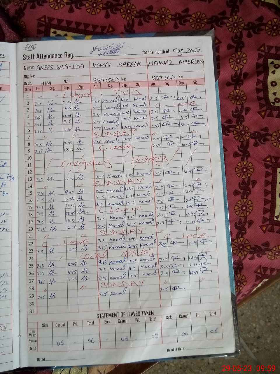 | Monitoring Date: 29-05-2023 | Start Time: 29-05-2023 09:36 AM | End Time: 29-05-2023 10:35 AM | Name of MEA: Sa**** Hu**** | |