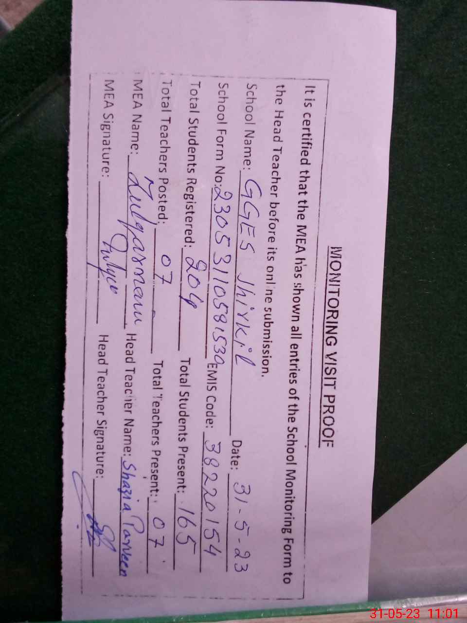 | Attendance Register | Head Teacher | MEA with School | Visit Proof |