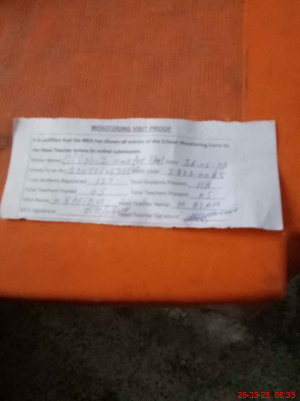 | Attendance Register | Head Teacher | MEA with School | Visit Proof |