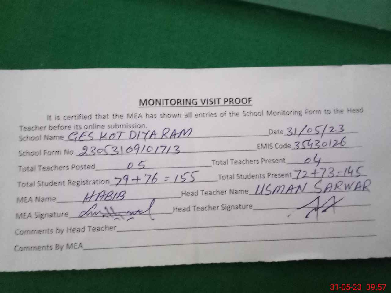 | Attendance Register | Head Teacher | MEA with School | Visit Proof |