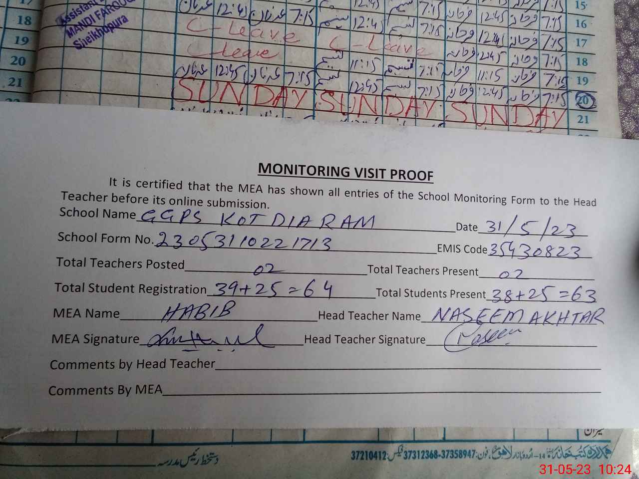 | EMIS Code: 35430823 | Name of School: GGPS KOT DIA RAM | |||