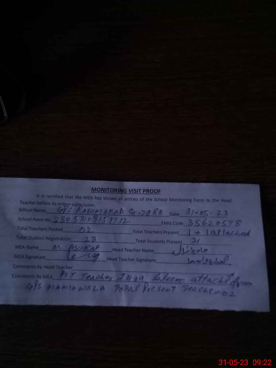 | Attendance Register | Head Teacher | MEA with School | Visit Proof |