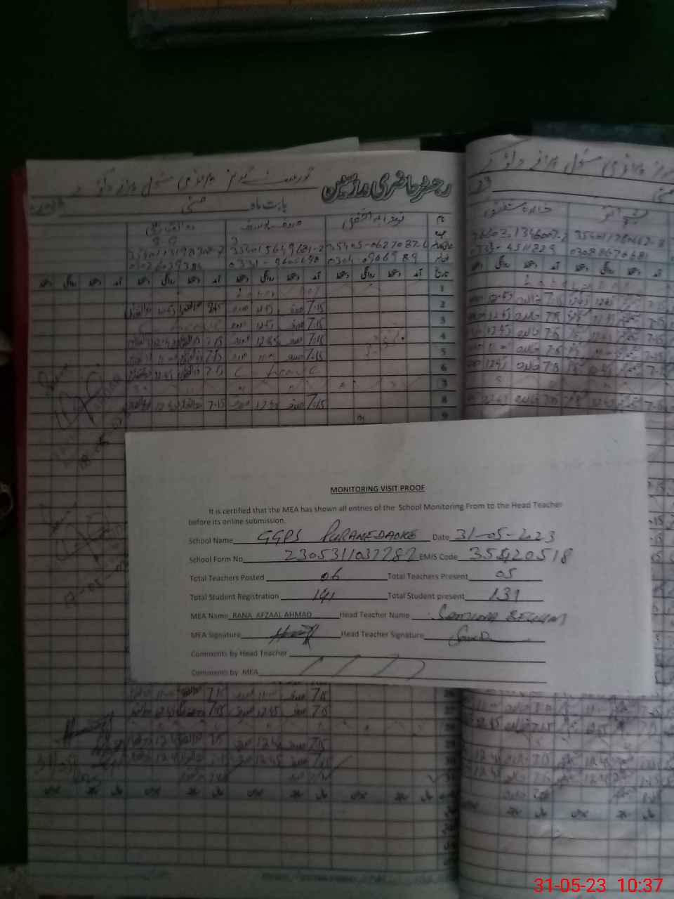 | Attendance Register | Head Teacher | MEA with School | Visit Proof |