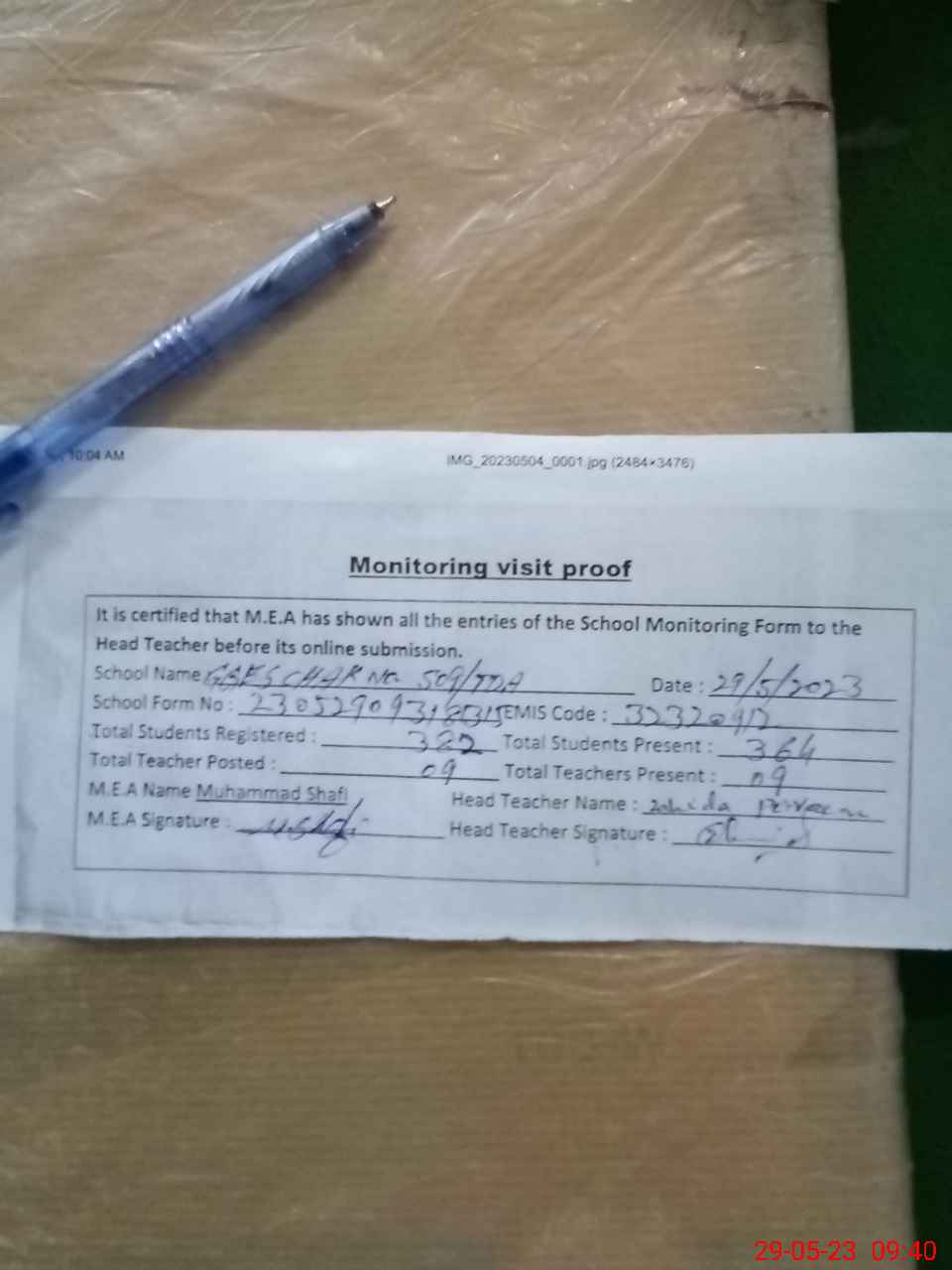 | Attendance Register | Head Teacher | MEA with School | Visit Proof |