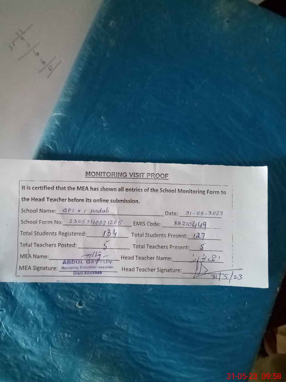 | Attendance Register | Head Teacher | MEA with School | Visit Proof |