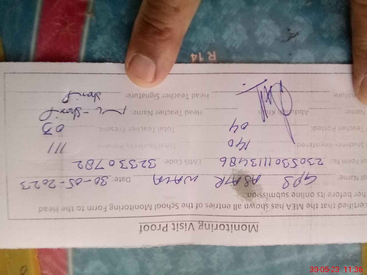 | Attendance Register | Head Teacher | MEA with School | Visit Proof |