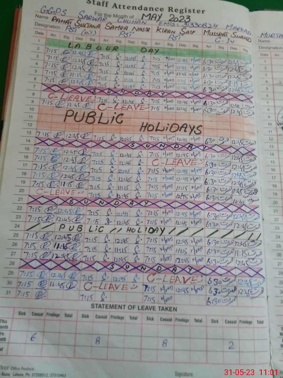 | Leave | Duty | Absent | Maternity | Medical | Ex- Pak |