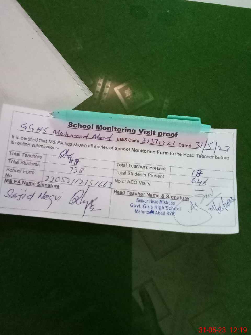 | EMIS Code: 31331221 | Name of School: GGHS MEHMOOD ABAD | |||