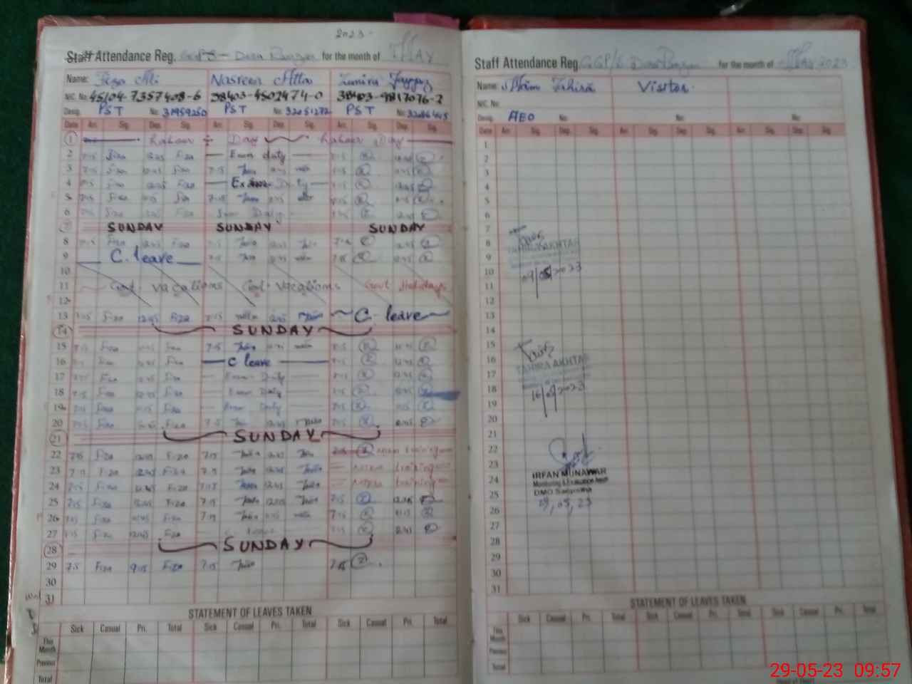 | CNIC | Full Name | Designation | R/C | Absence During Last Calender Month |