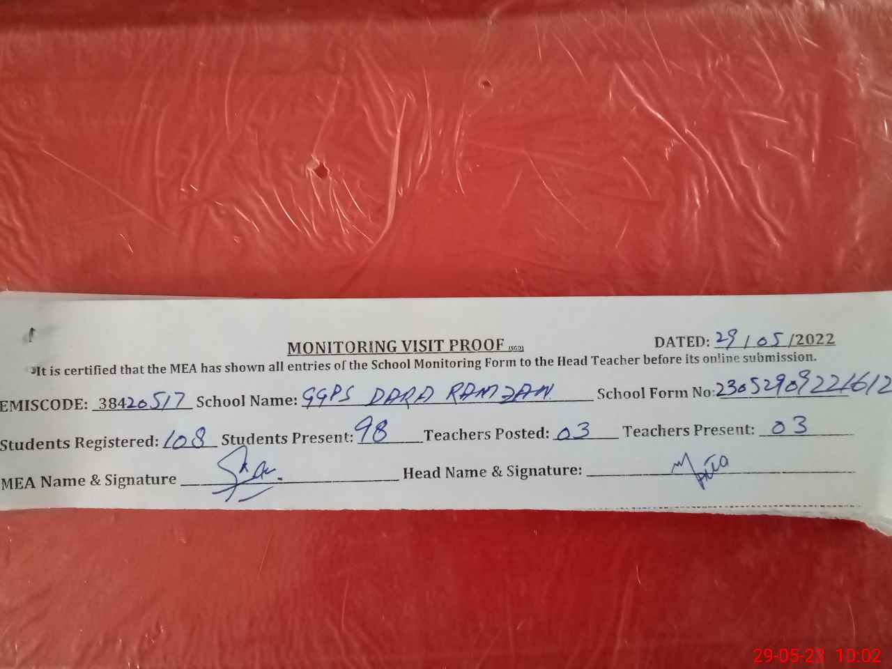 | Attendance Register | Head Teacher | MEA with School | Visit Proof |