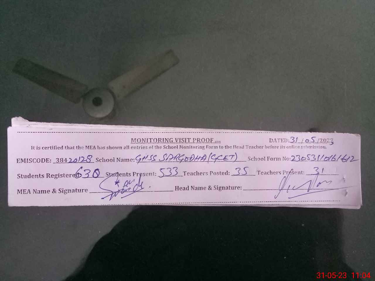 | Attendance Register | Head Teacher | MEA with School | Visit Proof |