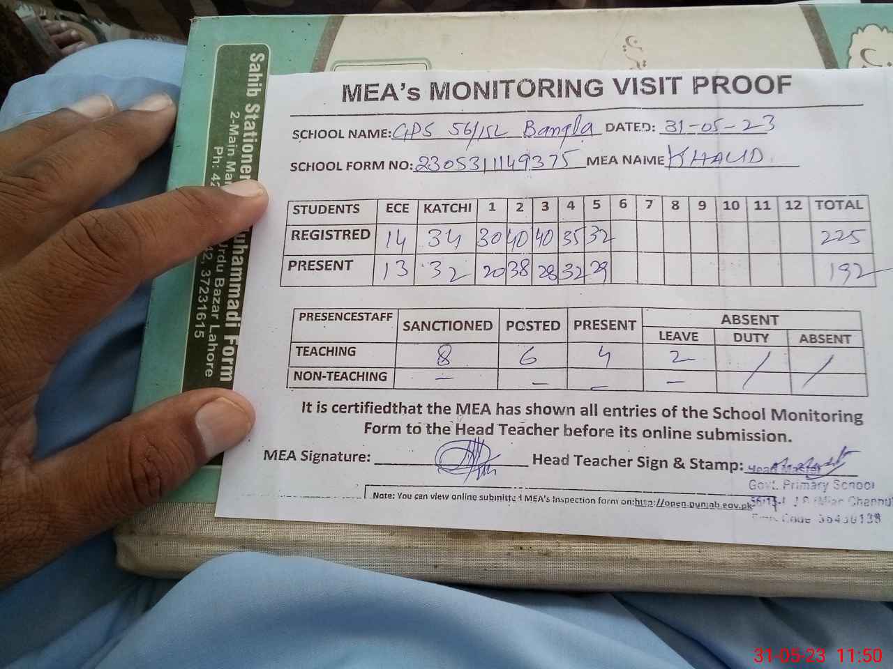 | EMIS Code: 36430138 | Name of School: GPS 56/15-L BANGLA, MIAN CHANNU | |||