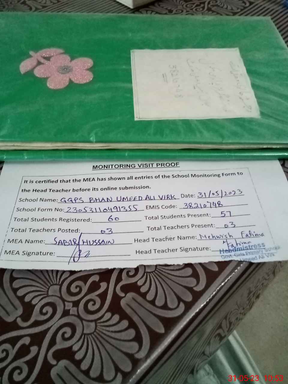| EMIS Code: 38210748 | Name of School: GGPS BHAN UMEED ALI VIRK | |||