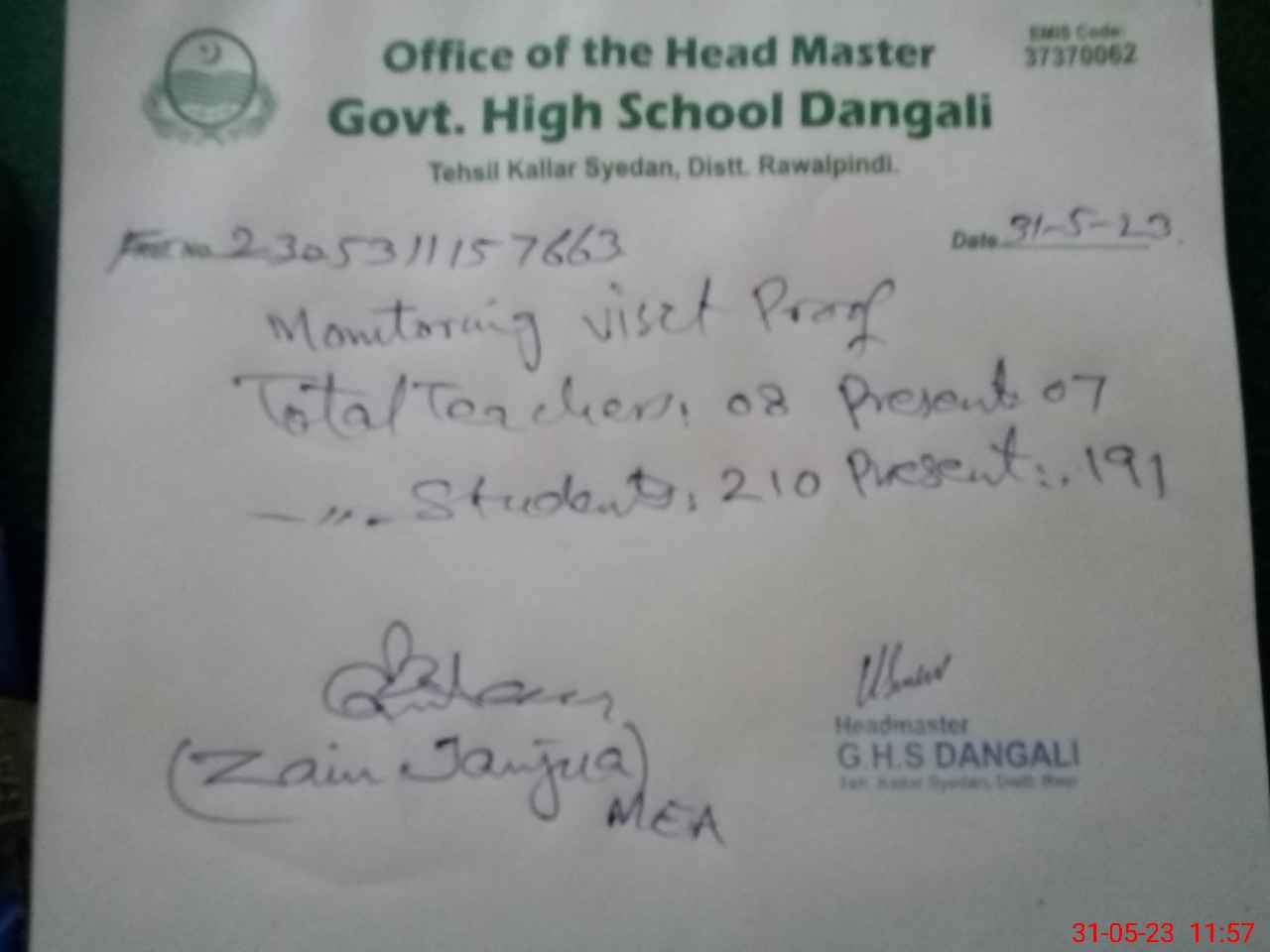 | EMIS Code: 37370062 | Name of School: GHS DANGALI | |||