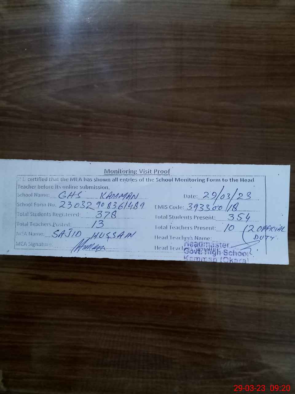 | Attendance Register | Head Teacher | MEA with School | Visit Proof |