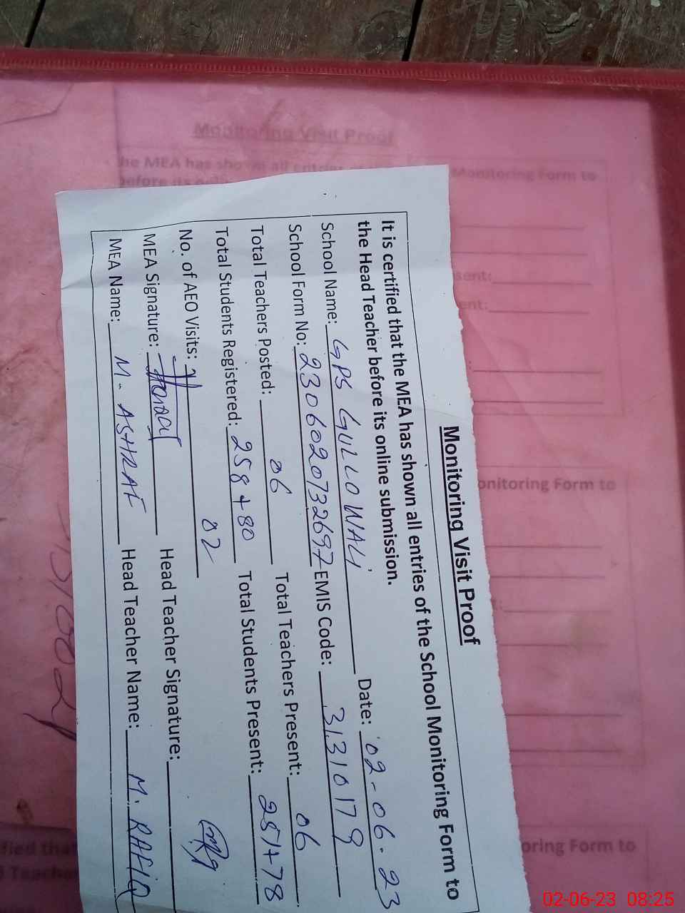 | Attendance Register | Head Teacher | MEA with School | Visit Proof |