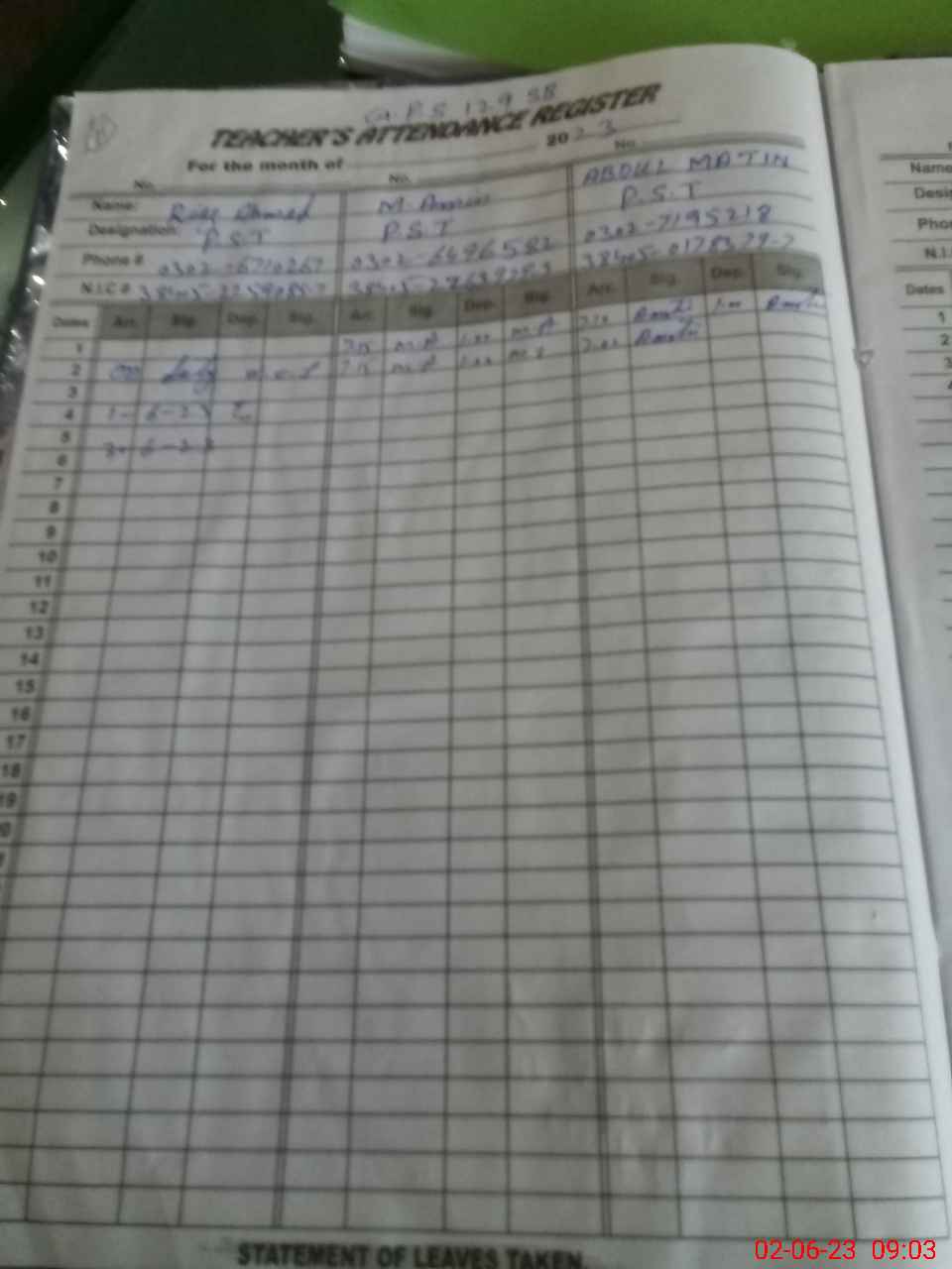 | CNIC | Full Name | Designation | R/C | Absence During Last Calender Month |