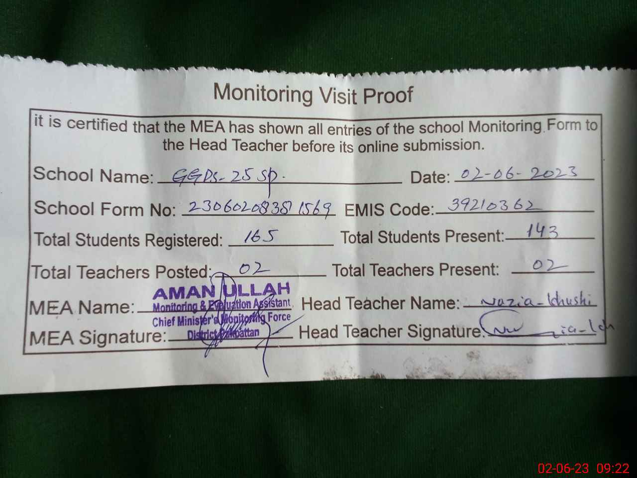 | Attendance Register | Head Teacher | MEA with School | Visit Proof |