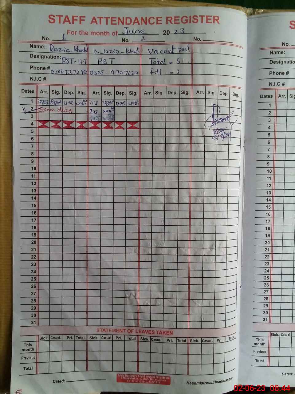 | Name: Na**** Kh**** Designation: (School Headmaster's/Headmistress's) PST Phone/Cell Number: 03**** |