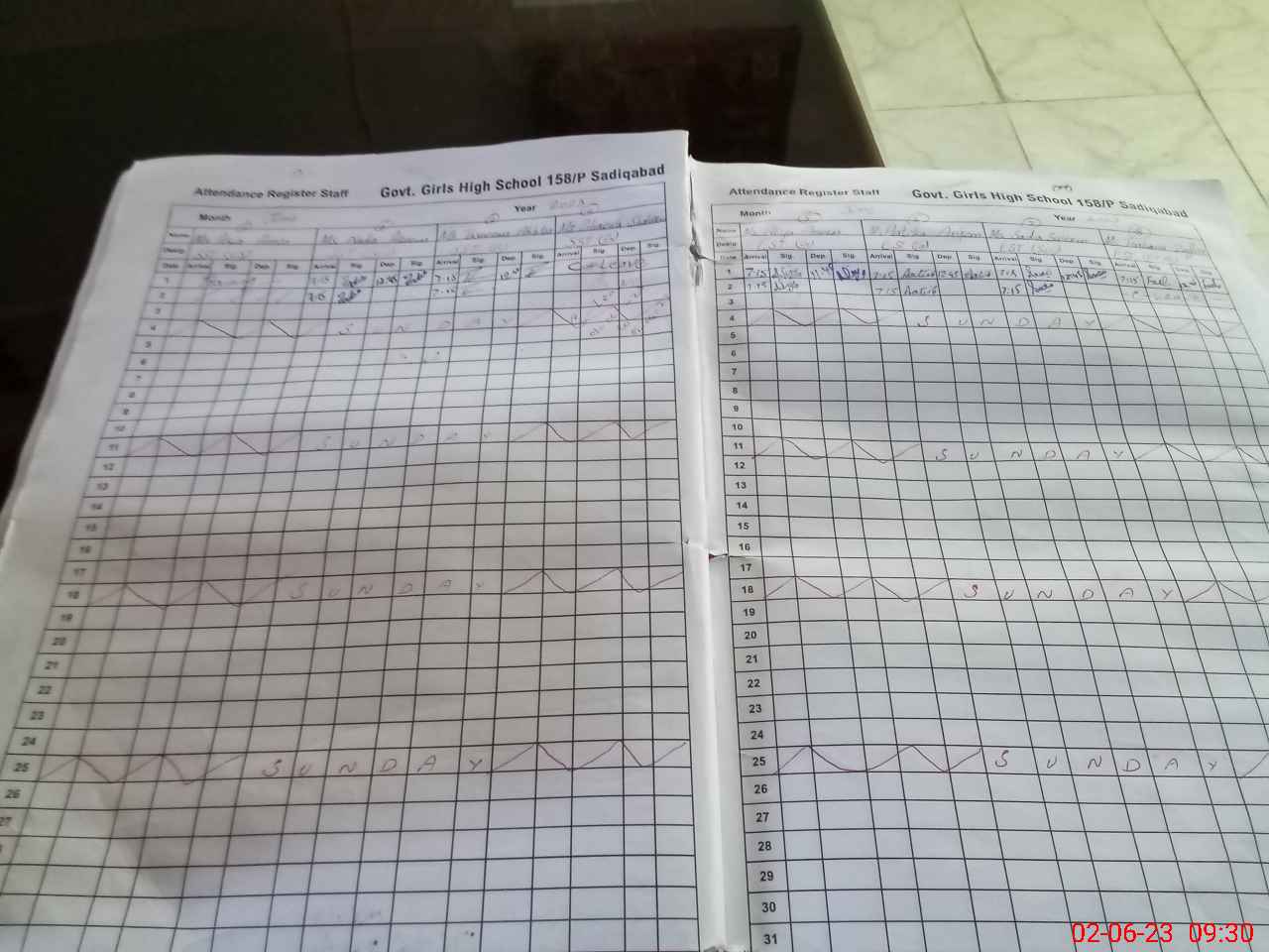 | Total no. of Classrooms: 9 No. of Classrooms Used for Teaching: 0 No. of Classrooms Storing Old Furniture, FTBs, etc: 0Comments if Any: Cash books of NSB and FTF not available at school Mr Kanoo Gee sweeper temporary deputed letter not available at school so marked as absent |