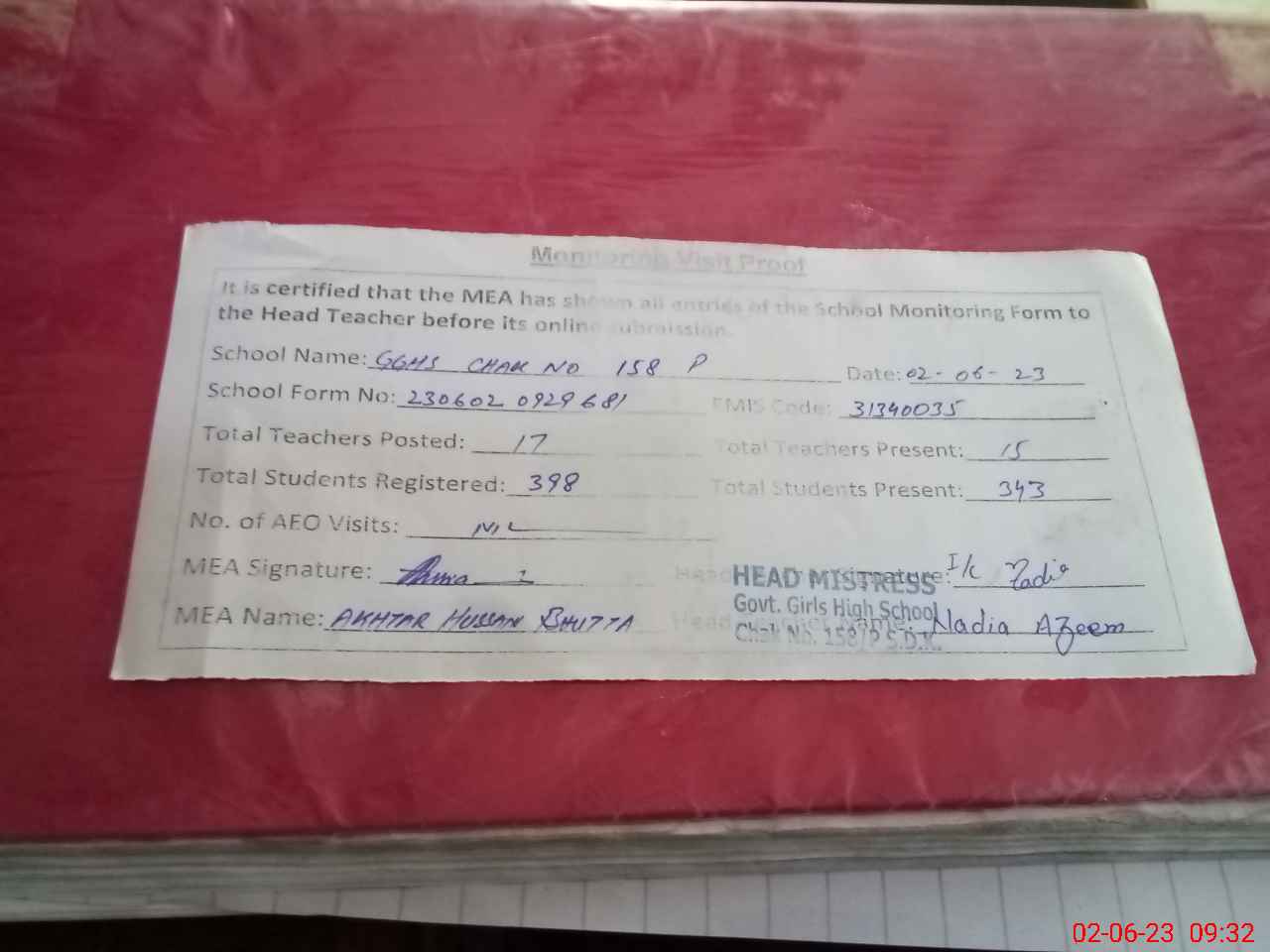 | EMIS Code: 31340035 | Name of School: GGHS CHAK NO. 158/P | |||