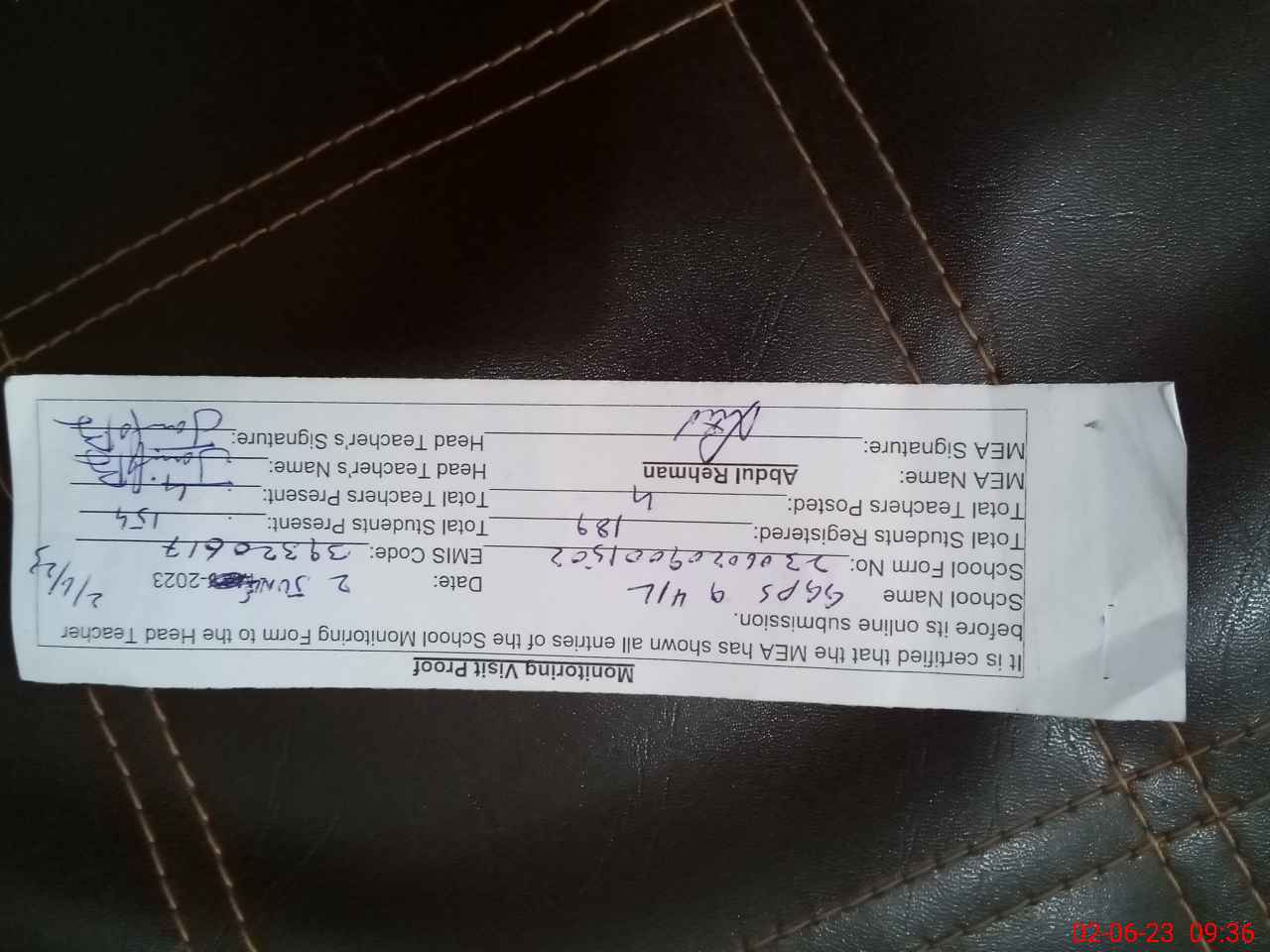 | Attendance Register | Head Teacher | MEA with School | Visit Proof |
