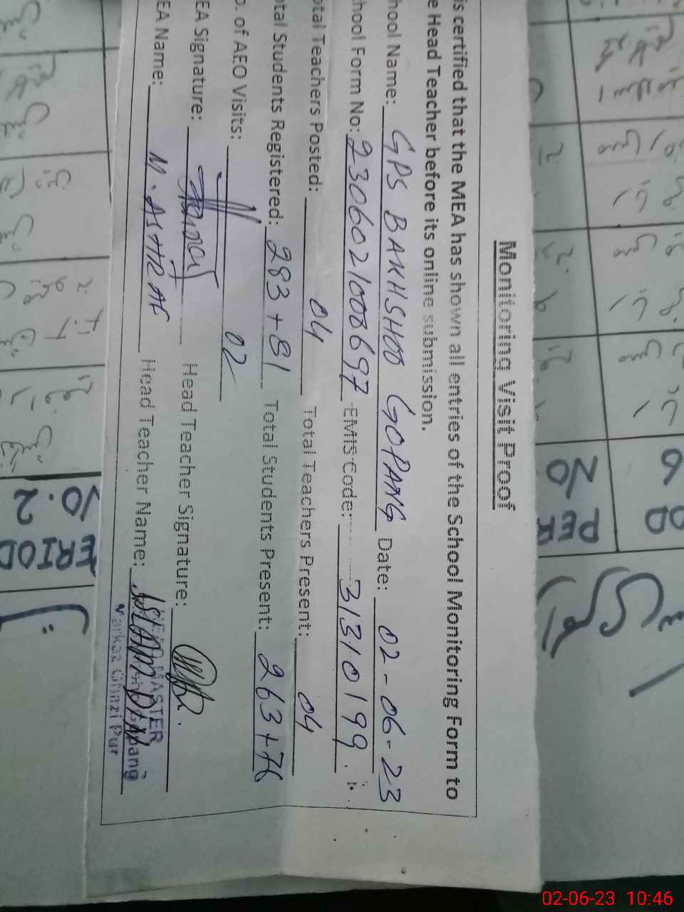 | Attendance Register | Head Teacher | MEA with School | Visit Proof |