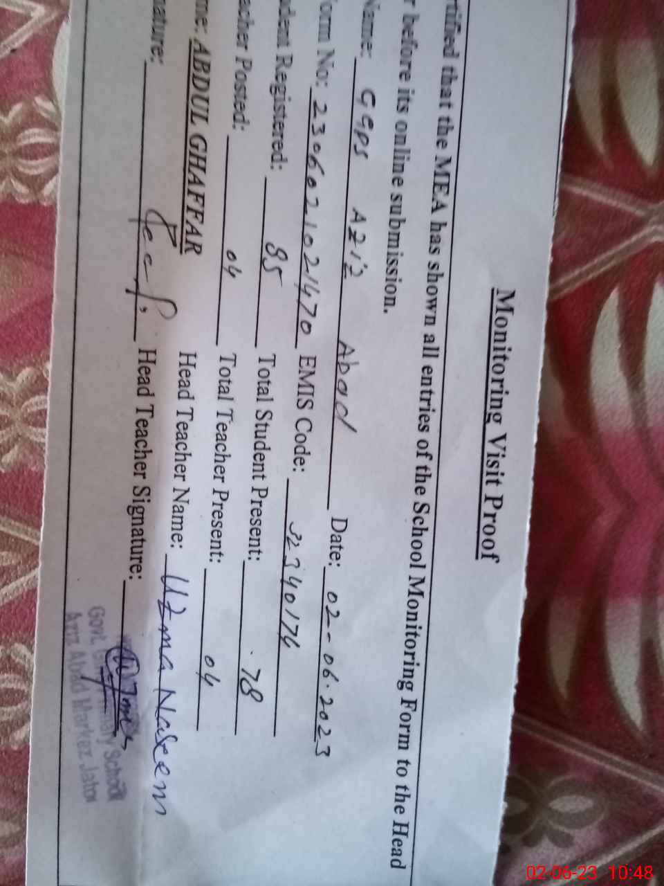 | Attendance Register | Head Teacher | MEA with School | Visit Proof |