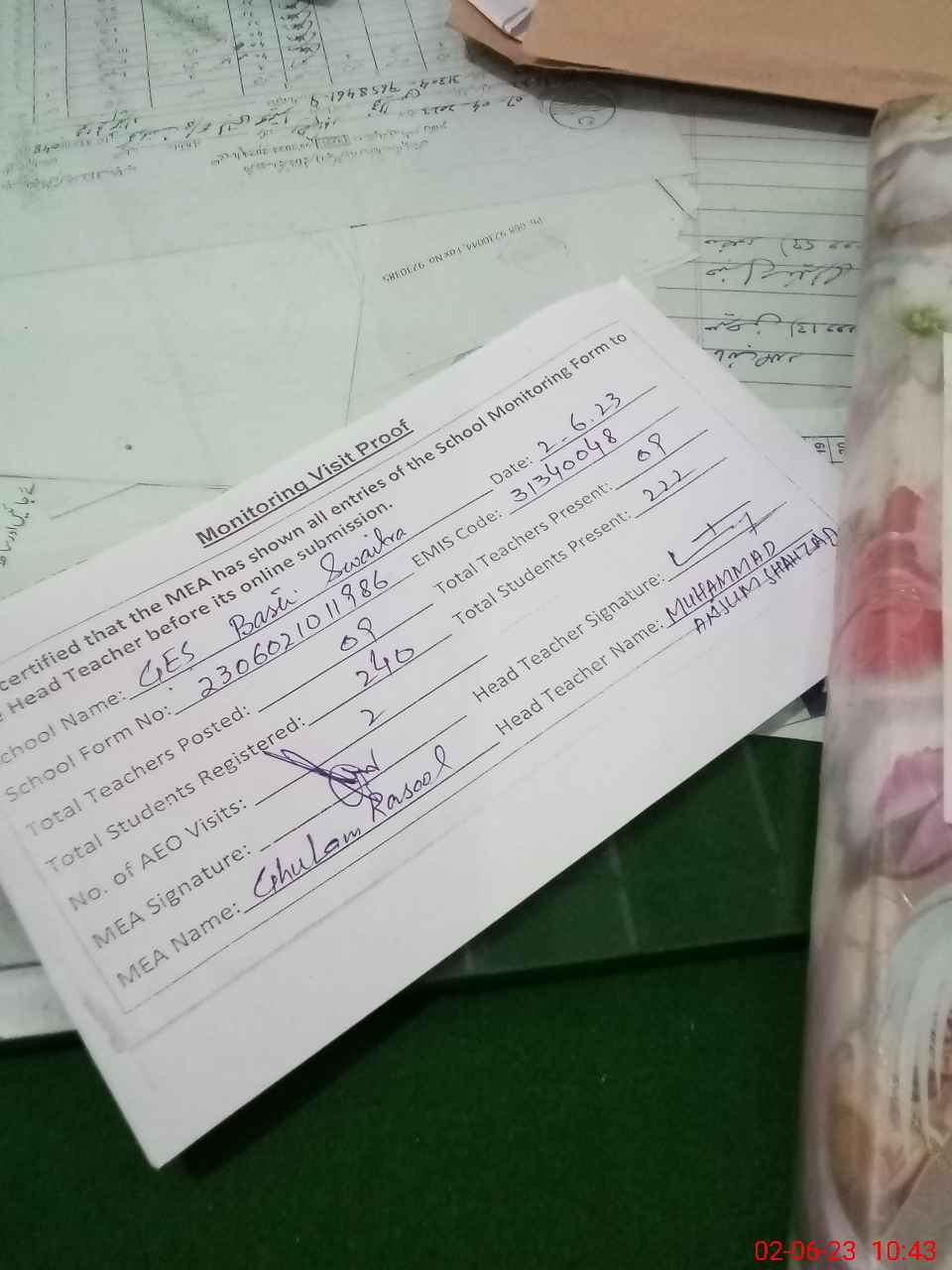 | Name: M.**** Sh**** Designation: (School Headmaster's/Headmistress's) S.S.T.gen Phone/Cell Number: 03**** |