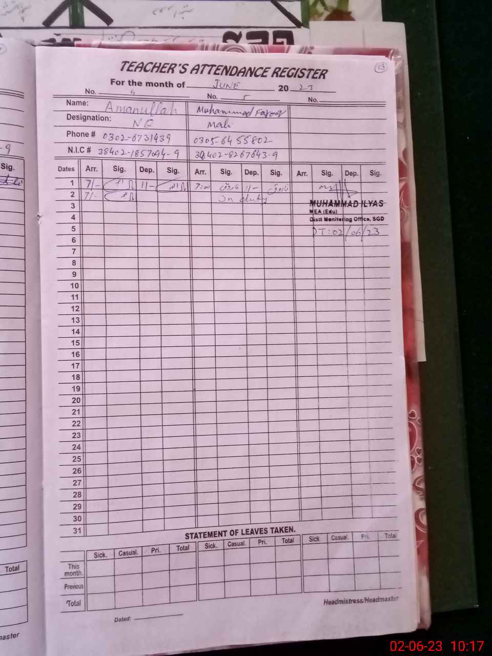 | Name: MU**** AL**** Designation: (School Headmaster's/Headmistress's) EST (GENRAL) Phone/Cell Number: 03**** |
