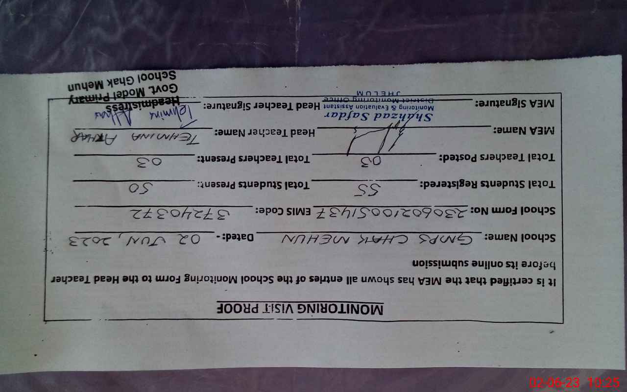 | EMIS Code: 37240372 | Name of School: GMPS CHAK MEHUN | |||