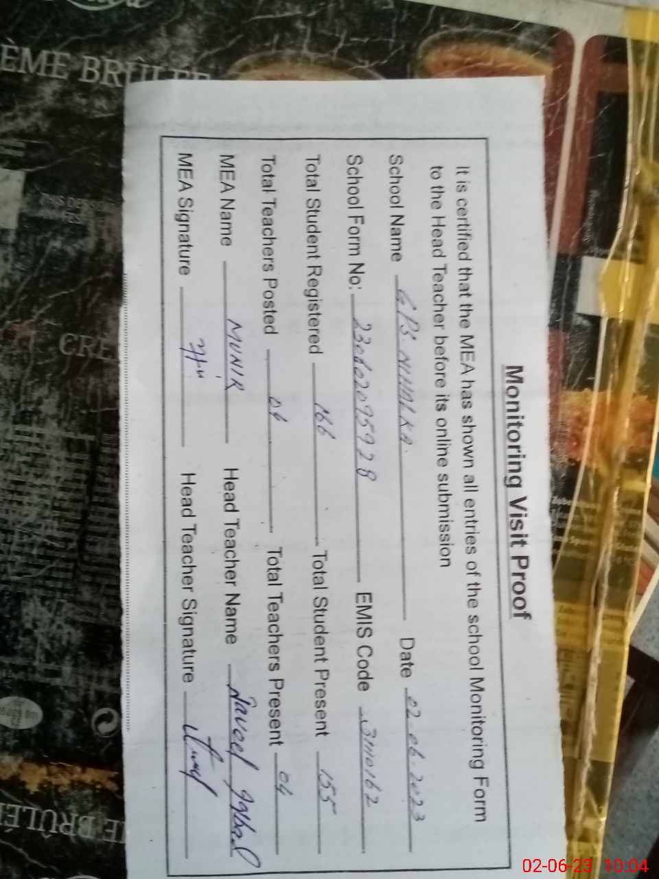 | Attendance Register | Head Teacher | MEA with School | Visit Proof |