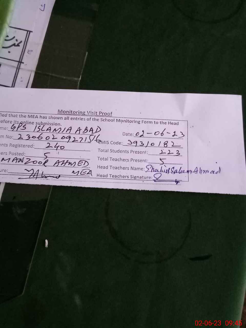 | Attendance Register | Head Teacher | MEA with School | Visit Proof |