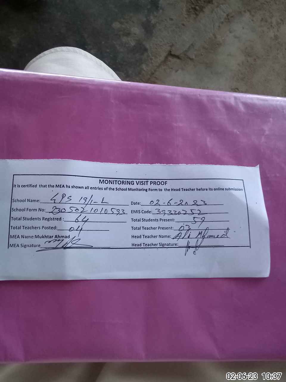 | Attendance Register | Head Teacher | MEA with School | Visit Proof |