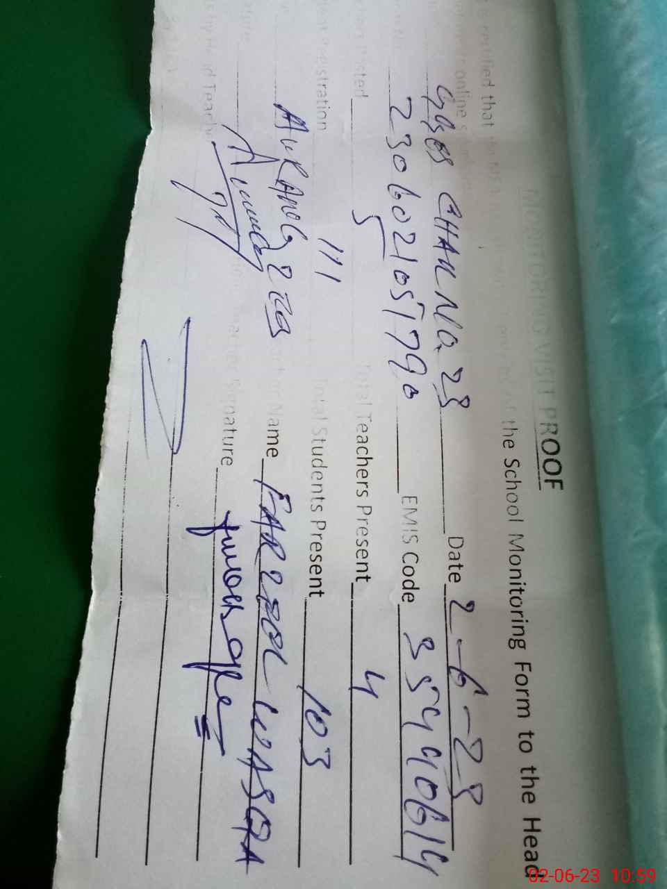 | Attendance Register | Head Teacher | MEA with School | Visit Proof |