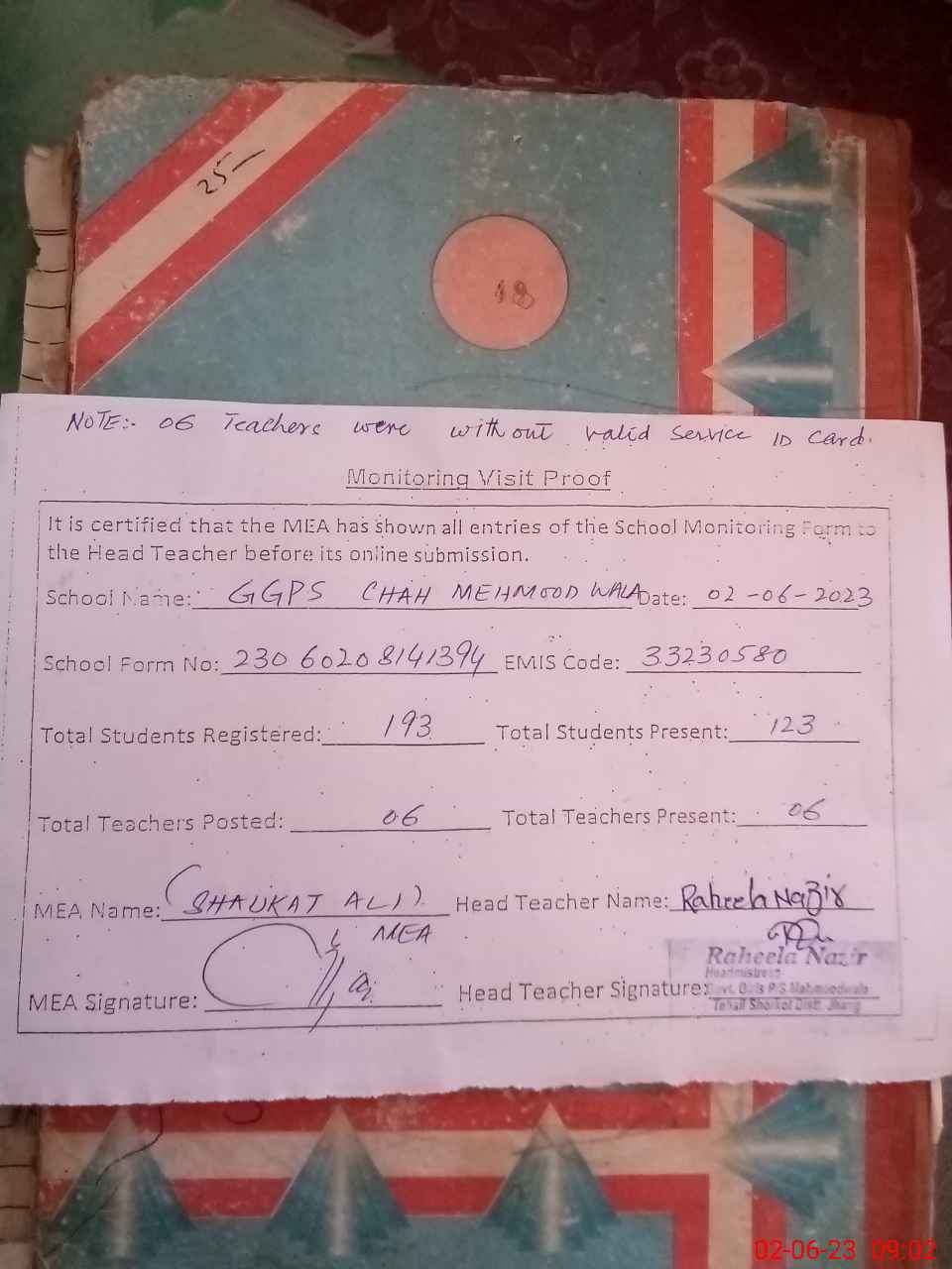 | Attendance Register | Head Teacher | MEA with School | Visit Proof |