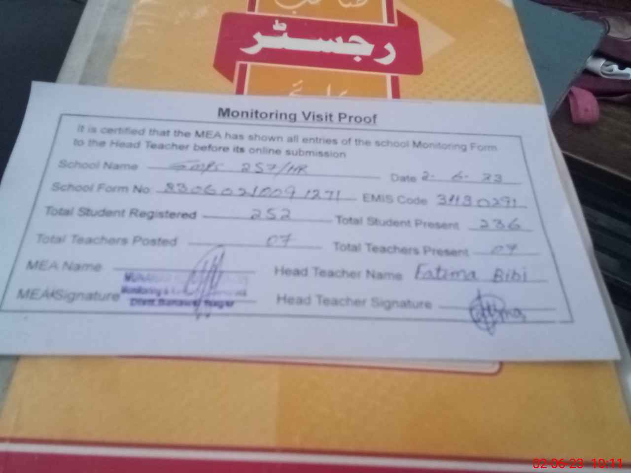 | Attendance Register | Head Teacher | MEA with School | Visit Proof |