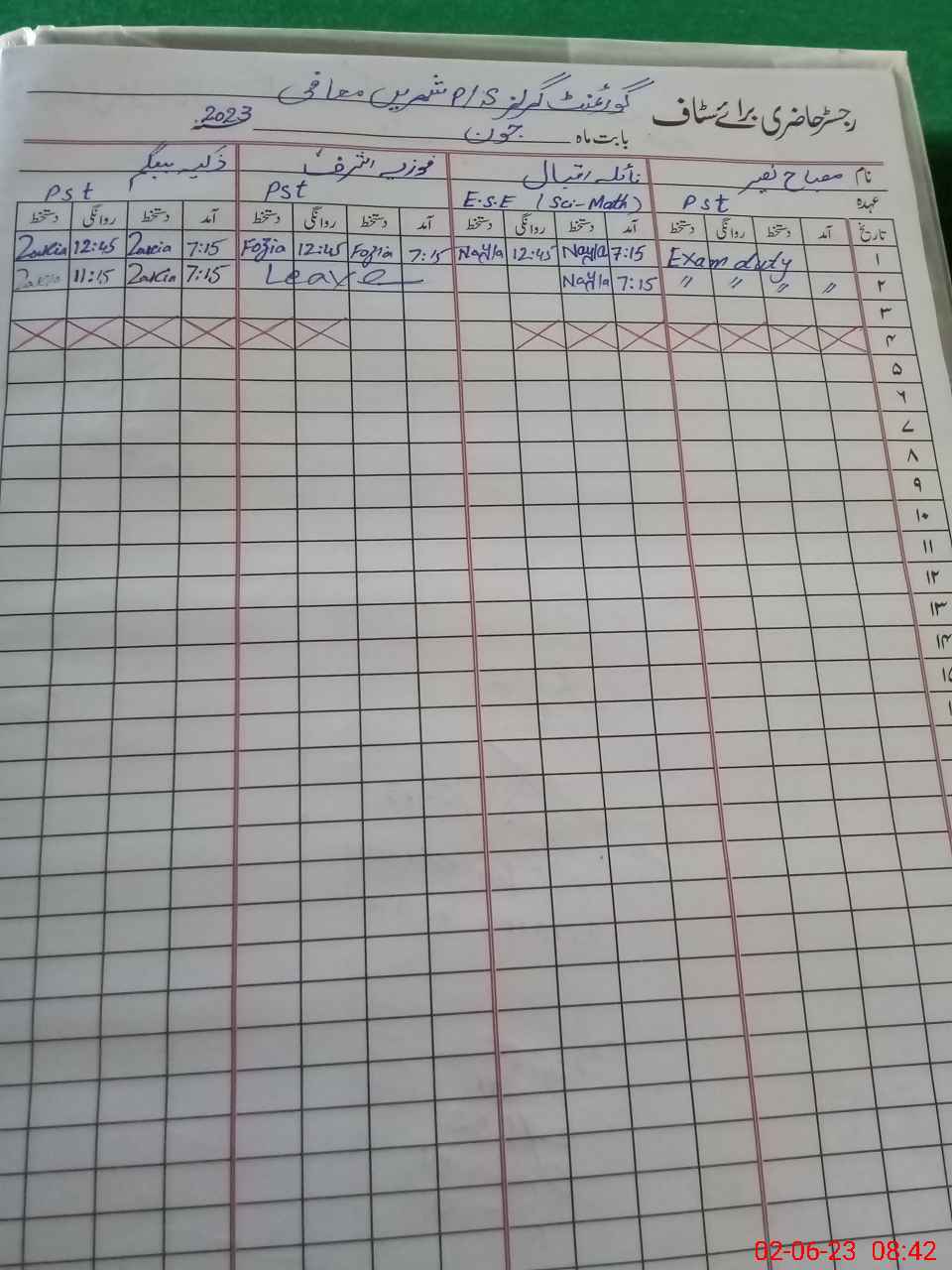 | 35**** | Mi**** Na**** | PST | Regular | 0 | 0 | 0 | 0 | 0 | 0 | 0 | 0 | 0 | Exam Duty |