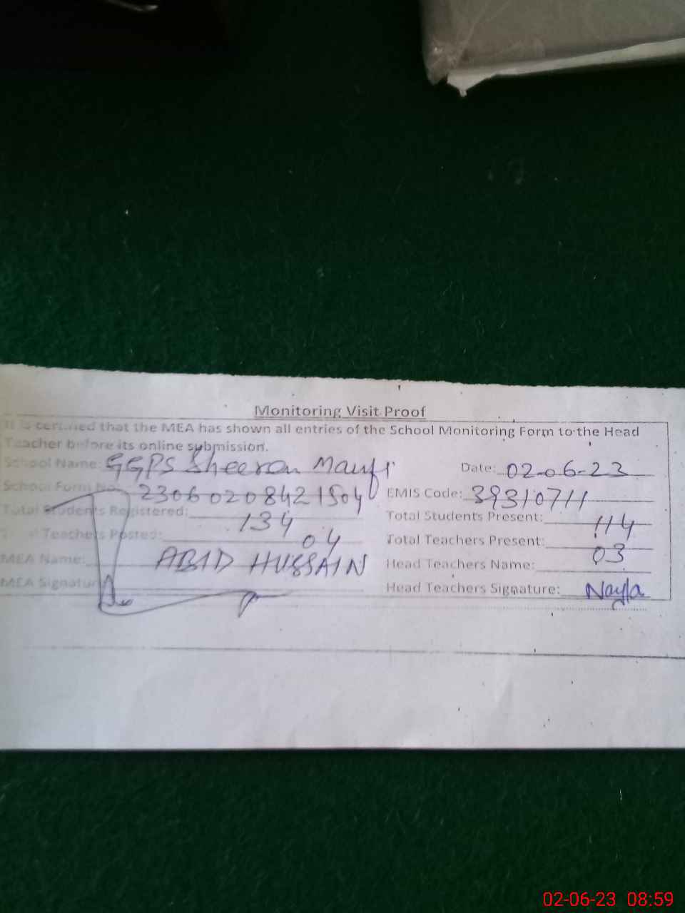 | Attendance Register | Head Teacher | MEA with School | Visit Proof |