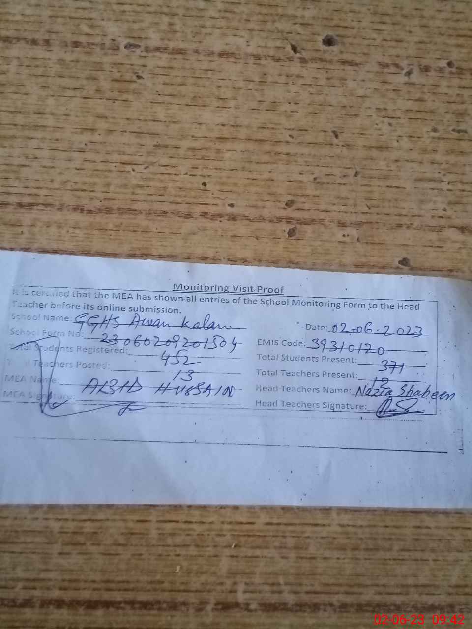 | Attendance Register | Head Teacher | MEA with School | Visit Proof |